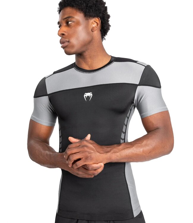 De Venum Tempest Men's Short Sleeve Rashguard in zwart / grijs dient als een tweede huid om bescherming te bieden tegen verwondingen en bewegingsvrijheid tijdens het worstelen. De compressietechnologie van de rash guard helpt ook om het herstel van de spieren te bevorderen.